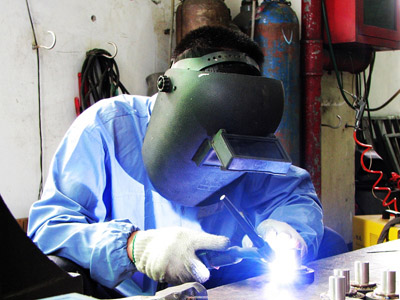 氩弧焊技术是在普通电弧焊的原理的基础上,利用氩气对金属焊材的保护,通过高电流使焊材在被焊基材上融化成液态形成溶池,使被焊金属和焊材达到冶金结合的一种焊接技术,由于在高温熔融焊接中不断送上氩气,使焊材不能和空气中的氧气接触,从而防止了焊材的氧化,因此可以焊接不锈钢、铁类五金金属。
